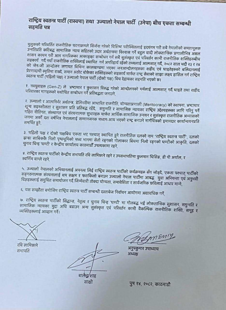 काठमाडौं । राष्ट्रिय स्वतन्त्र पार्टी (रास्वपा) र उज्यालो नेपाल पार्टी (उनेपा)बीच एकता गर्ने सहमति भएको छ। कमल पोखरीमा सोमबार साँझ कुलमान, रवि र काठमाडौं महानगरपालिकाका मेयर बालेन्द्र साहबीच भएको वार्तामा यो सहमति भएको हो ।