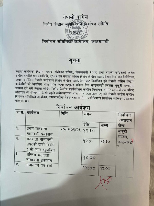 कांग्रेस विशेष महाधिवेशनः यस्तो छ नयाँ नेतृत्वका लागि निर्वाचन तालिका