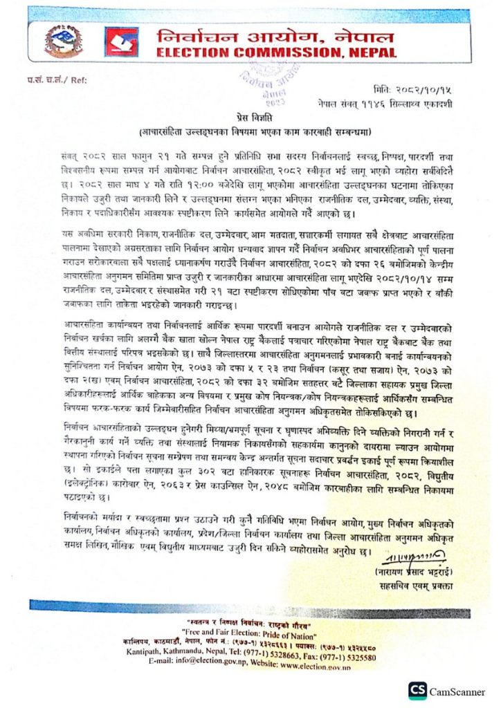 आचारसंहिता लागू भएदेखि माघ १४ गतेसम्म राजनीतिक दल, उम्मेदवार र संस्थासमेत गरी २१ वटा स्पष्टीकरण सोधिएकोमा पाँच वटा जवाफ प्राप्त भएको र बाँकी जवाफका लागि ताकेता भइरहेको प्रवक्ता भट्टराईले बताए । निर्वाचन आचारसंहिता अनुगमन अधिकृतसमेत तोकिसकिएको भट्टराईले बताए ।