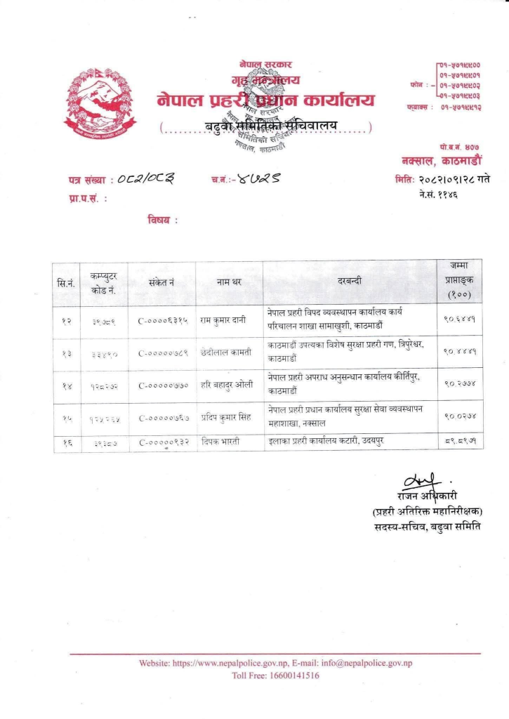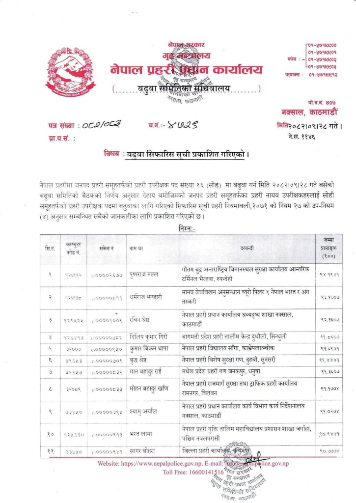 बढुवा सिफारिस हुने सूचीको पहिलो नम्बरमा डीएसपी पुष्पराज मल्ल छन् । डिएसपीहरू धर्मराज भण्डारी, रबिन श्रेष्ठ, दिलिप कुमार गिरी, कुमार विक्रम थापा, बुद्ध श्रेष्ठ, मान बहादुर राई, मोहन बहादुर खाण, श्यामु अर्याल, भरत लामा, सागर बोहरा, रामकुमार दानी र छेदीलाल कामती लाई बढुवा सिफारिस गरिएको छ ।