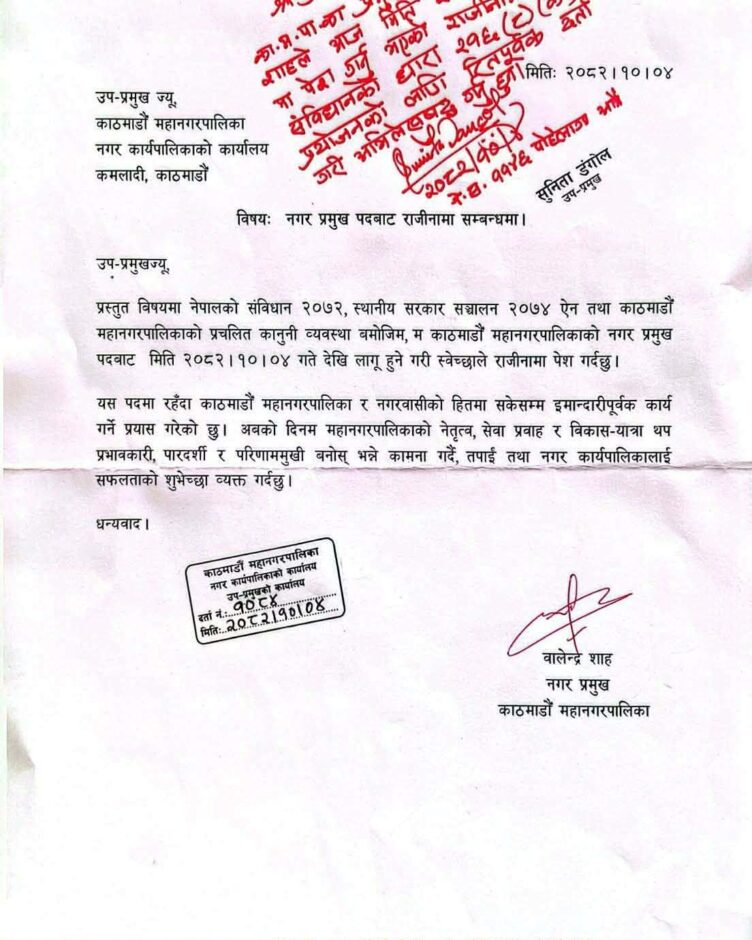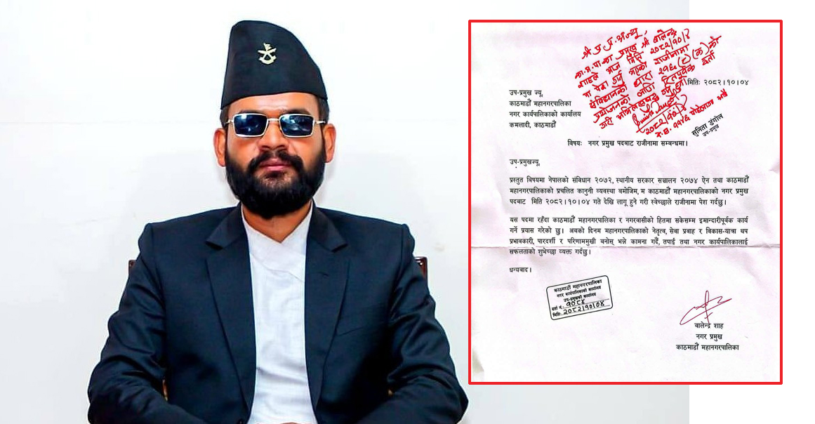 उनले उपमेयर सुनिता डंगोललाई आइतबार राजीनामा बुझाएका हुन् । उनी आगामी निर्वाचनमा रास्वपाबाट प्रधानमन्त्रीका उम्मेदवार हुनेगरी झापा(५ मा निर्वाचन लड्दै छन् ।