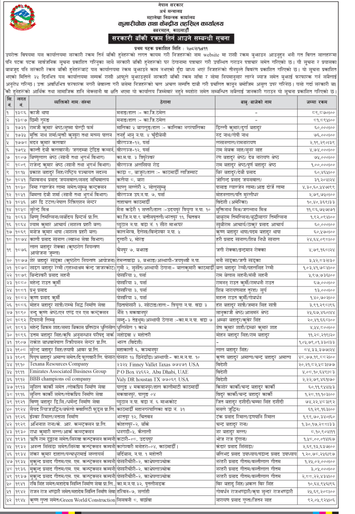 महालेखा नियन्त्रकको कार्यालय अन्तर्गतको कुमारी चोक तथा केन्द्रीय तहसिल कार्यालय बबरमहलले ती व्यक्तिको नाम, ठेगाना र तिर्नुपर्ने रकमसहितको विवरण आज सार्वजनिक गर्दै ३५ दिनभित्र साँवा ब्याज तिर्न भनेको छ। अन्यथा उनीहरुको चल अचल सम्पत्ति दाबी गरी प्रचलित कानुन बमोमिज असुल उपर गर्ने चेतावनी दिइएको छ।