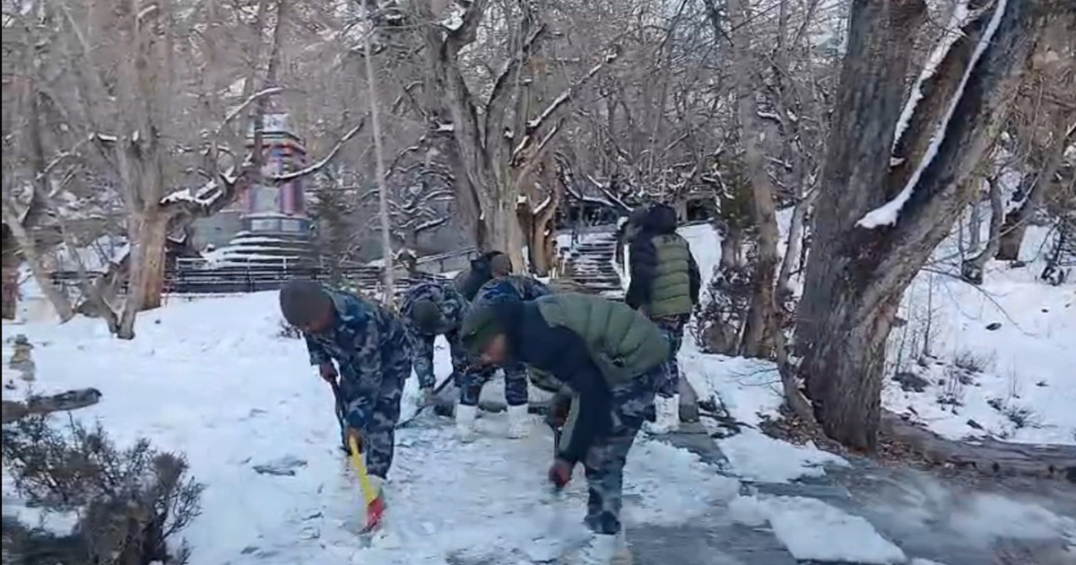 सशस्त्र प्रहरीले मुक्तिनाथ मन्दिरको हिउँ पन्छायाे